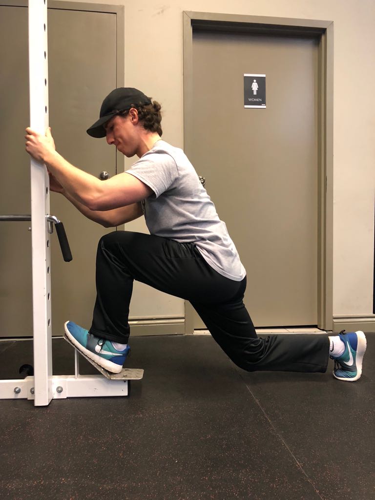 - Grab the rack in front of you, and pull your body forward into the stretch. Keep your hips set and allow your back foot to come up off the ground. Hold the position while taking 3 deep breaths.